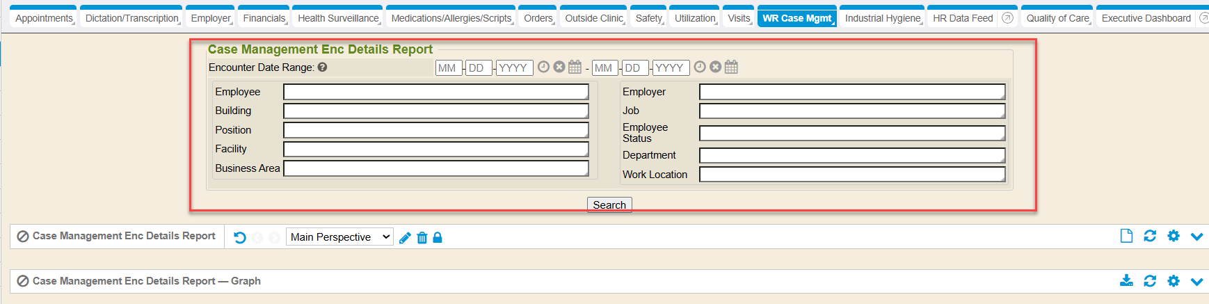 By default, the report will open up to be blank. It is recommended that you key in at least a date range before rendering the report. There are other search filter criteria data fields available to help narrow down your report results. However, you can get report results for the lifetime of the system by simply clicking on the first title section Case Management Enc Details Report below the search filter criteria area.